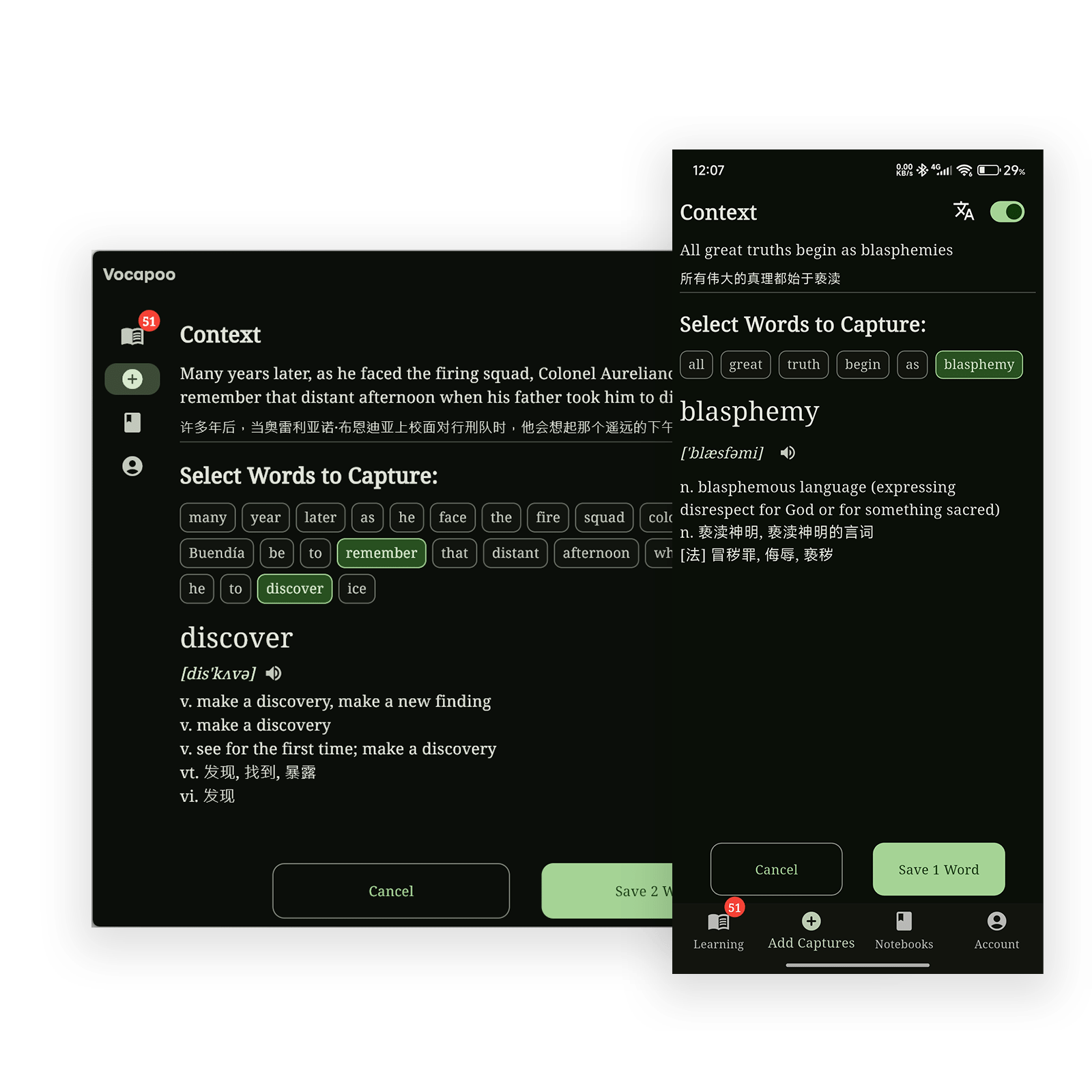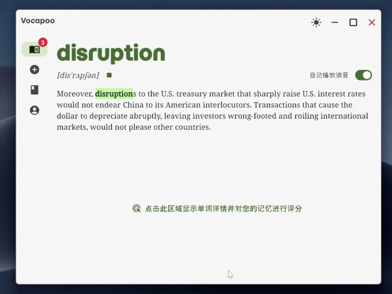 任何软件中,选中文本按下快捷键,Vocapoo自动拆分句子,只需点选生词,Vocapoo将连同语境和生词一起保存到笔记本等待过后回顾,这是在英文阅读中既不会打断阅读节奏,又得以记录陌生单词的最佳实践